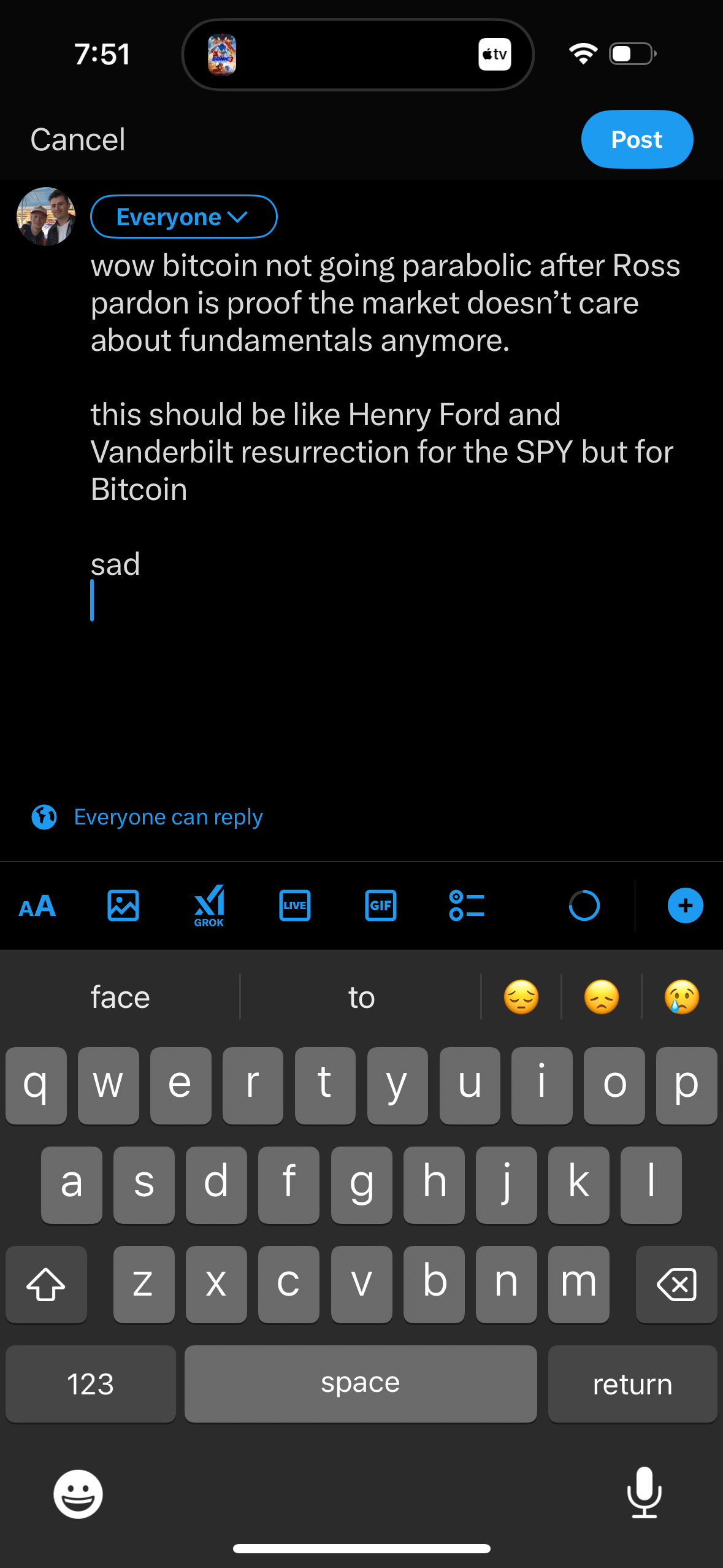 bitcoin not going parabolic after Ross pardon is proof the new market doesn’t care about fundamentals. this should be like Henry Ford and Vanderbilt resurrection for the SPY but for Bitcoin