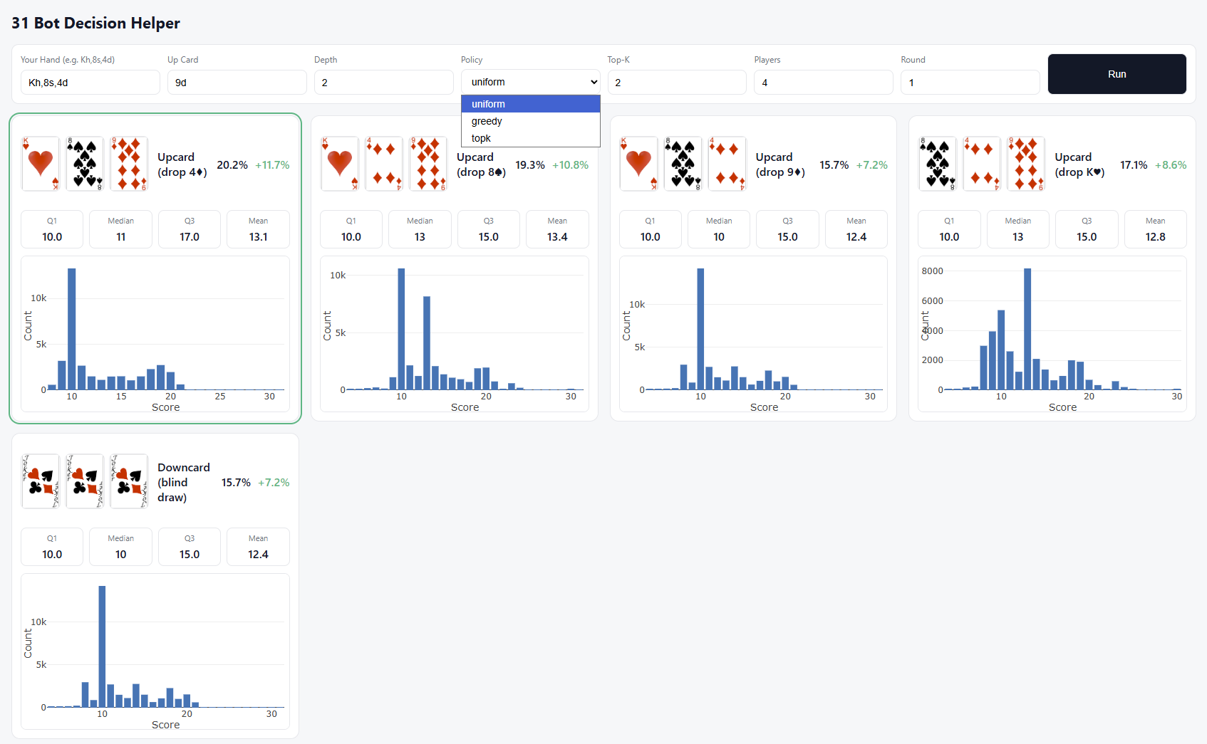 Build was pretty straightforward, given leaning heavily on LLM & some existing repos for other card games. Most of the compute heavy stuff (simulating games) was done locally and then moved over to my VPS as lookup tables as we are heavily compute constrained on that thing.