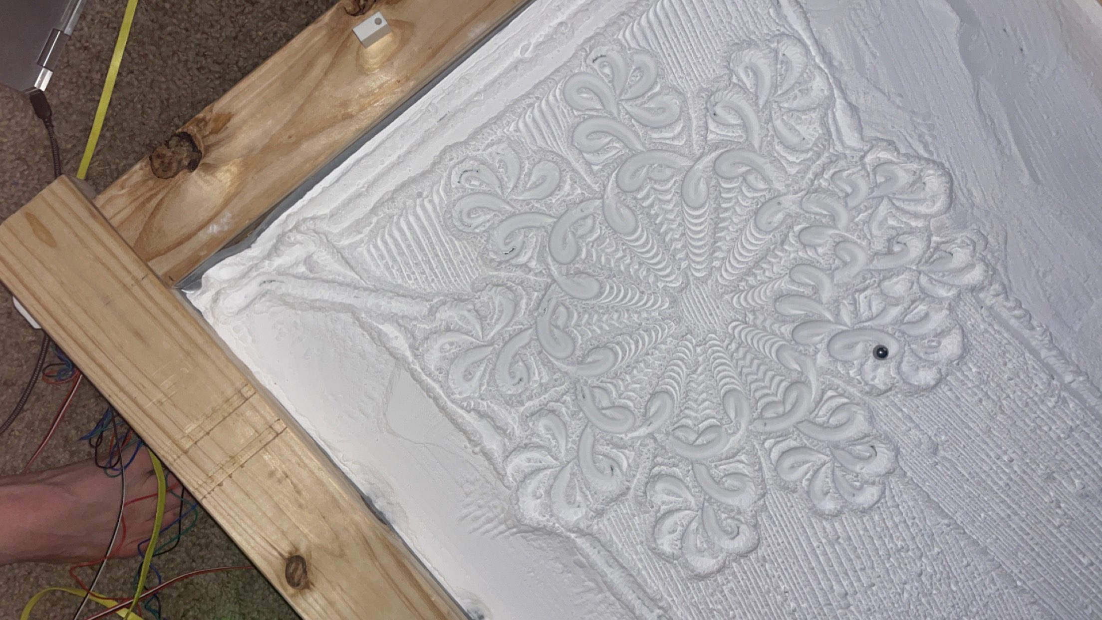 Pretty straight forward setup, 3 rails, 2 of which are being traveled by the 3d printed trucks via toothed belt which is fed through (2) cross corner motors. Middle arm can move up/down, left/right via motors going CW/CCW combinations. Middle arm then has magent which drags metal ball across the sand (baking soda)